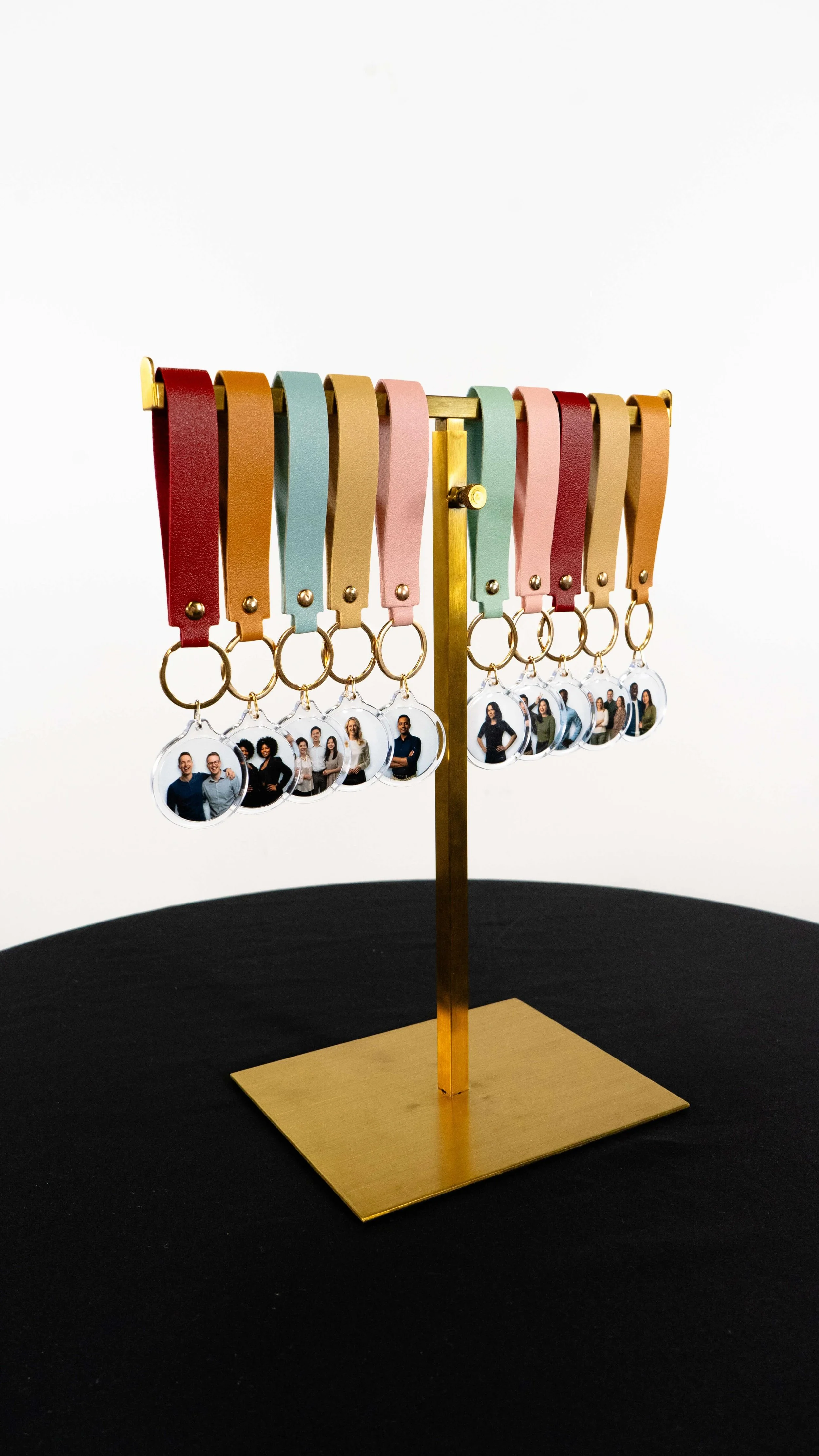 Doubled sided photo Keychains with faux leather straps in a variety of elegant colors and gold accents made onsite in seconds for your guests to take home and carry their memories with them.